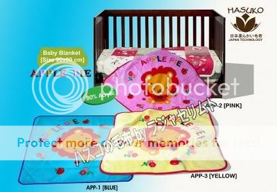 Selimut bayi dengan tokoh kartun Apple Pie hadir dengan tiga macam model APP-1 dengan warna dasar biru, APP-2 dengan warna dasar pink, dan APP-3 dengan warna dasar kuning. Komposisi 80% Acrylic dan 20% polyester membuat selimut ini lembut dan aman untuk bayi. Sifatnya yang anti alergi dan bulu yang tidak gampang tercabut menambah keunggulan selimut ini.