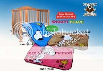 Selimut bayi dengan tokoh kartun Snoopy hadir dengan tiga macam model SNP-1 dengan warna dasar pink, SNP-2 dengan warna dasar biru, dan SNP-3 dengan warna dasar coklat. Komposisi 80% Acrylic dan 20% polyester membuat selimut ini lembut dan aman untuk bayi. Sifatnya yang anti alergi dan bulu yang tidak gampang tercabut menambah keunggulan selimut ini.